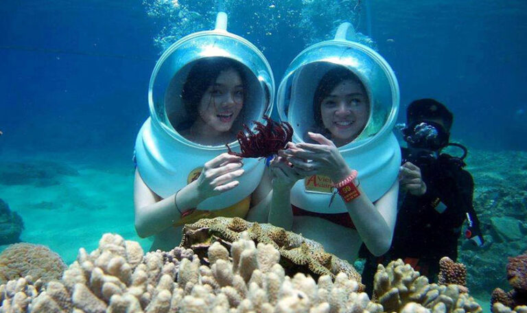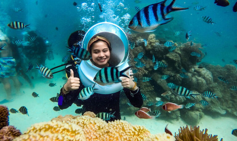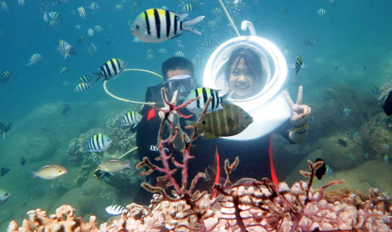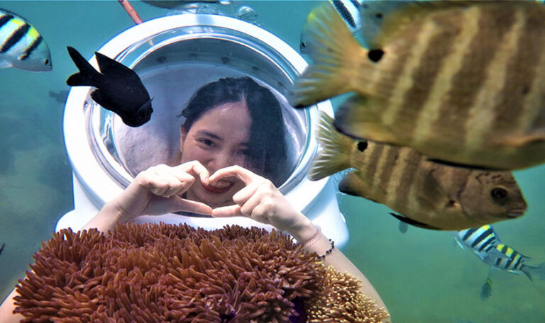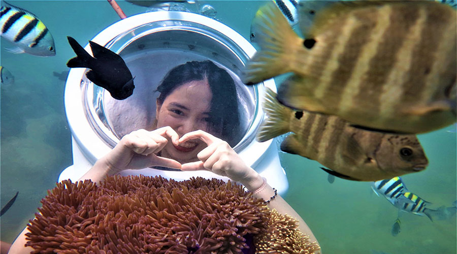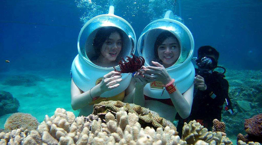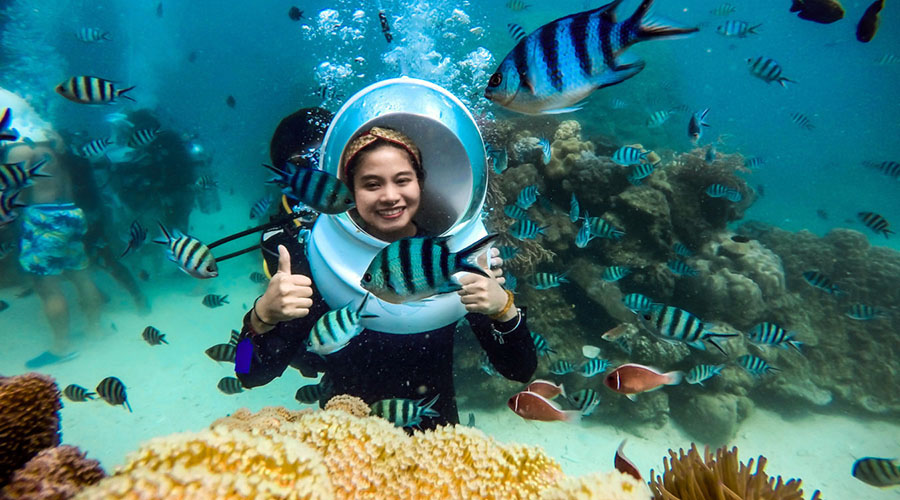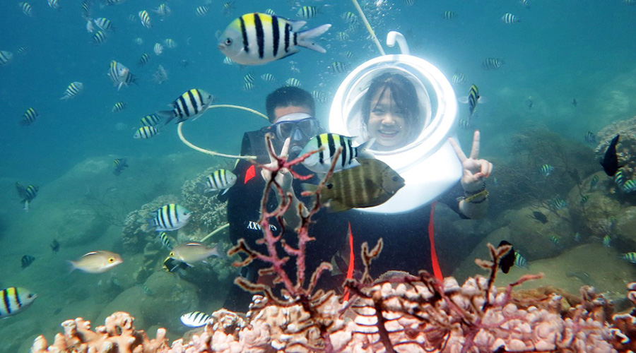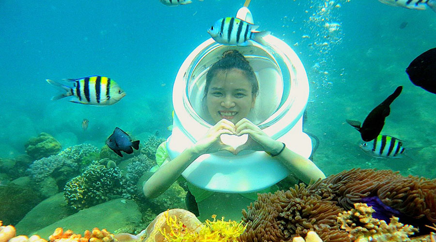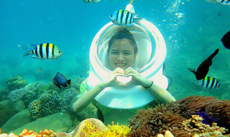 Lặn Mũ – Đi dạo dưới biển sẽ giúp Quý khách đi bộ dưới biển với mũ lặn như mũ phi hành gia để thở bình thường bằng mũi dưới nước mà không phải lo lắng về việc tiếp xúc mặt trực tiếp với nước hay nước vào tai hoặc bắt buộc phải thở bằng miệng dưới nước.